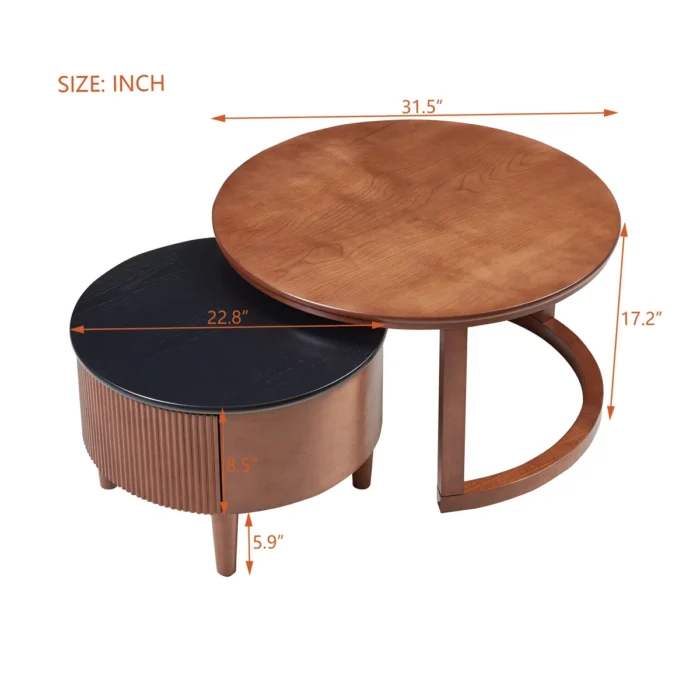 Upgrade your living space with this stylish round nesting coffee table set of 2, crafted from high-quality engineered wood with a smooth finish. The larger table features a spacious surface, while the smaller one comes with a hidden storage drawer to organize daily essentials like remotes, books, or accessories. Designed with fluted panel detailing, sturdy wooden legs, and contrasting tabletops (walnut & black finish), this set combines elegance with functionality.