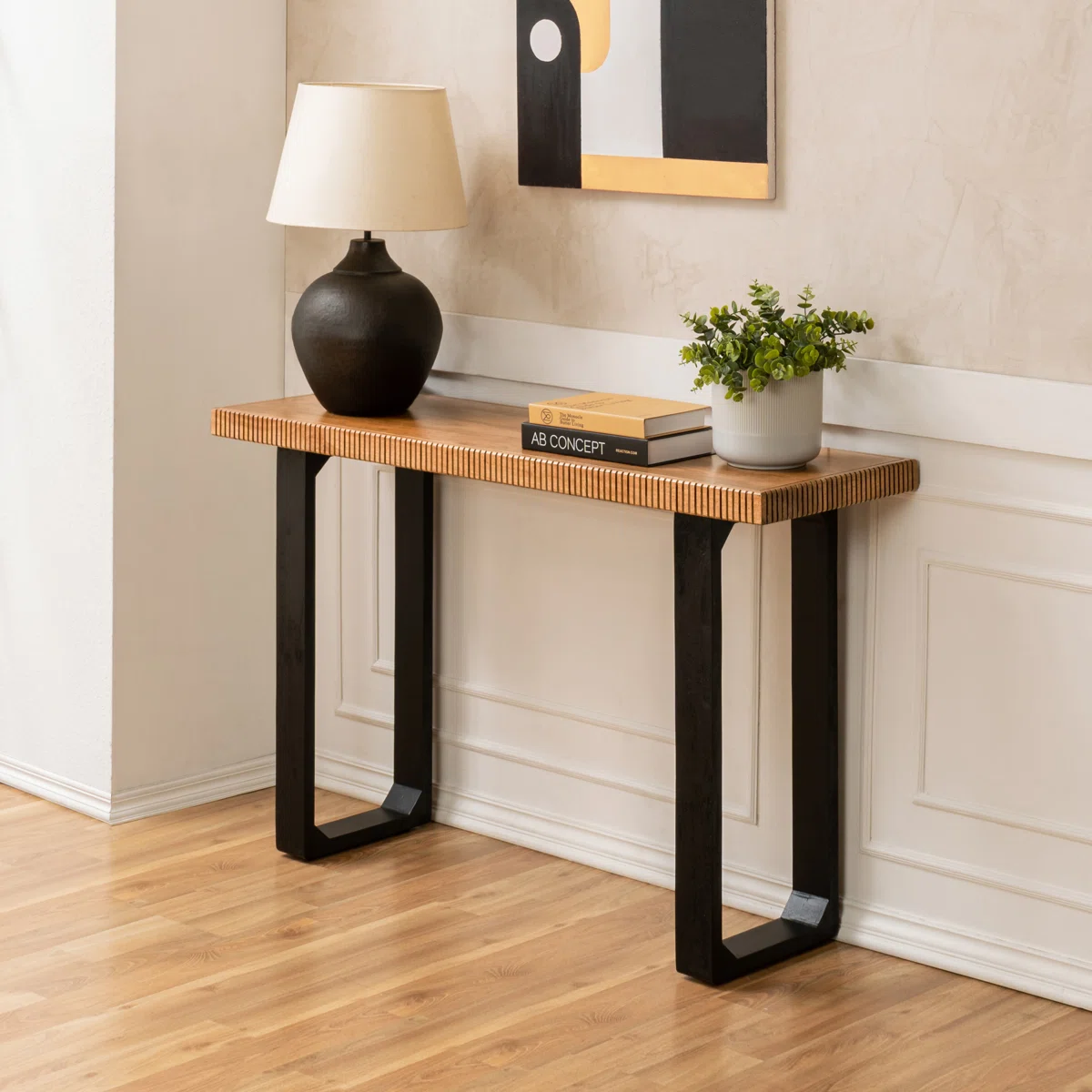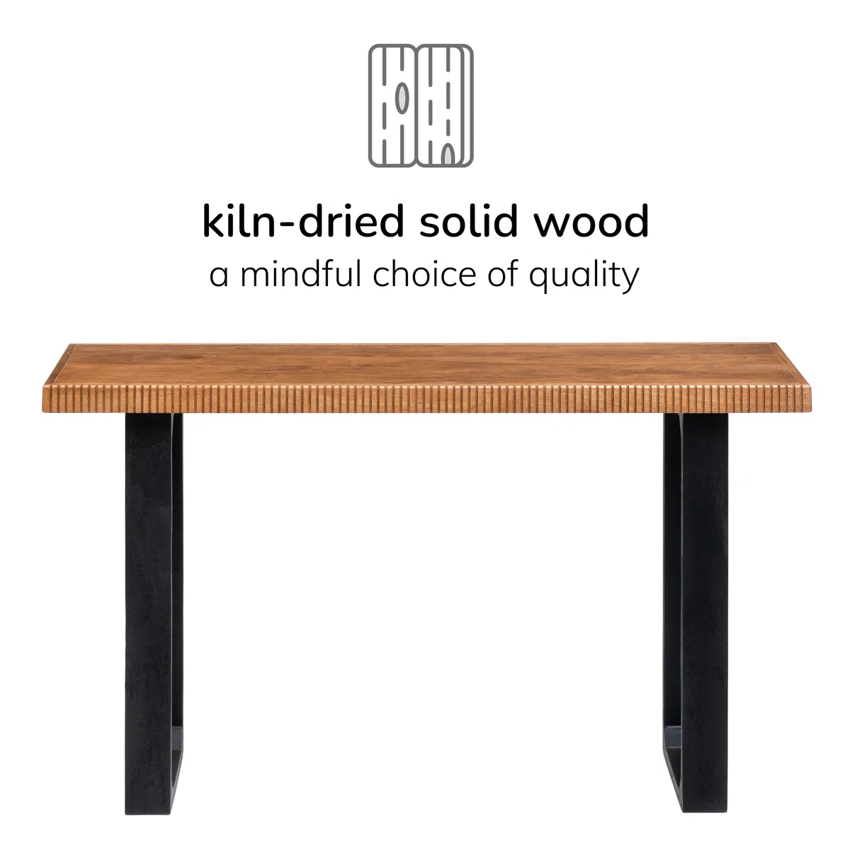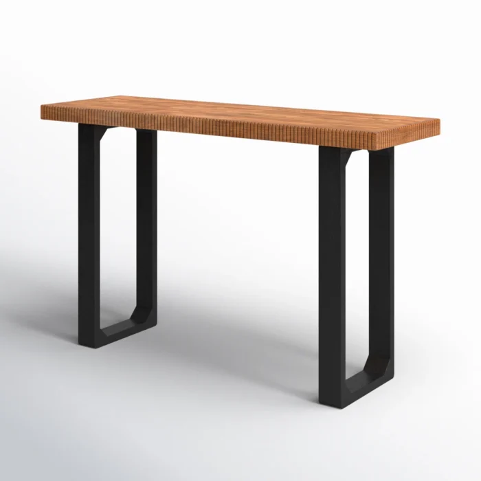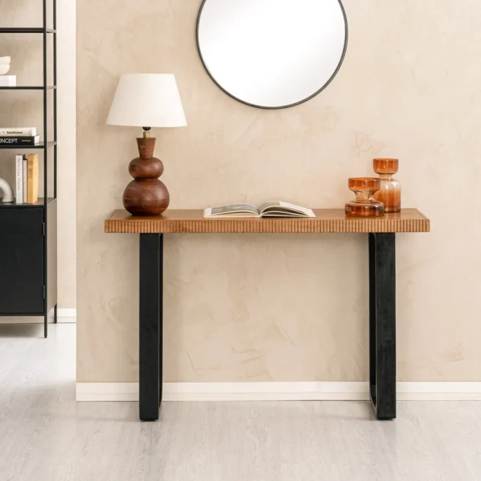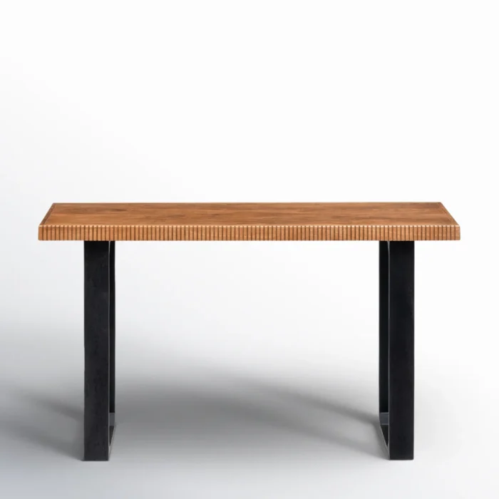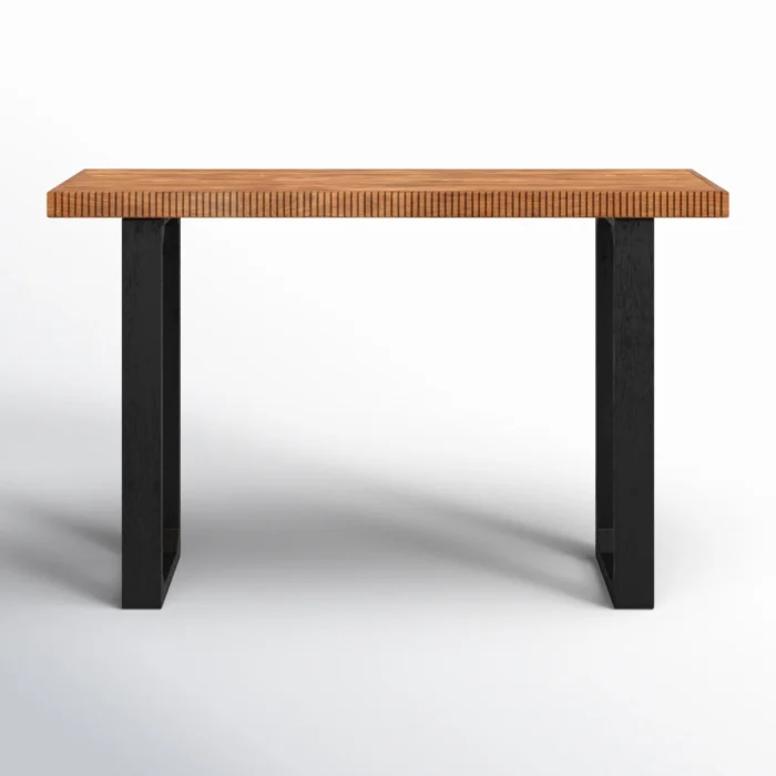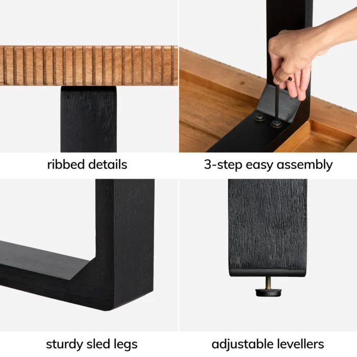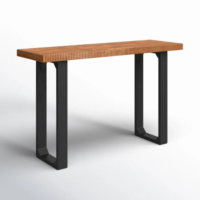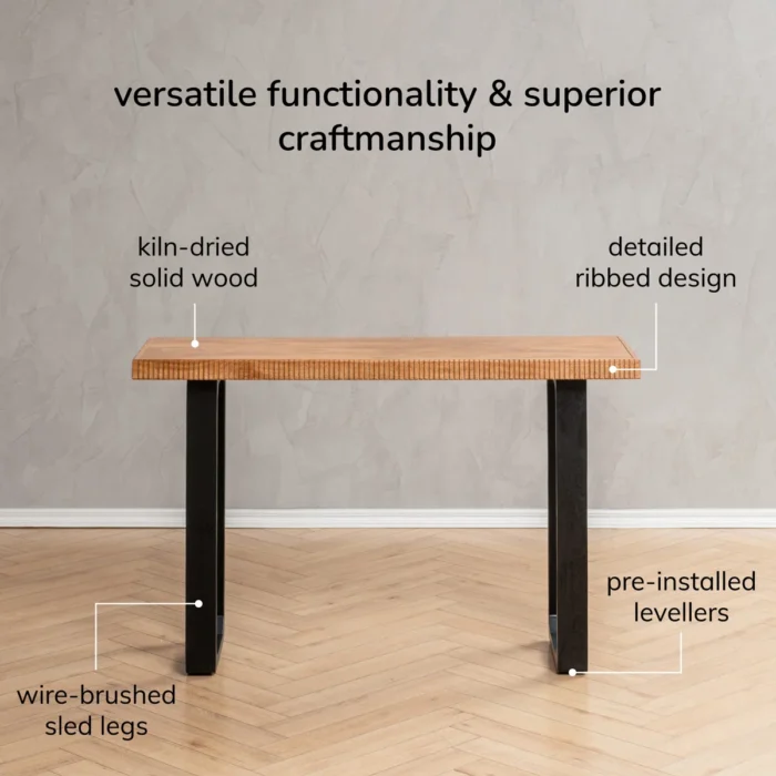 Add style and functionality to your space with this solid wood console table, crafted with a ribbed edge design and sturdy black sled legs. Perfect for use as an entryway table, hallway console, sofa side table, or display table, it combines modern craftsmanship with timeless appeal. Featuring kiln-dried wood, pre-installed levelers, and a smooth natural finish, this table is durable and versatile for Indian homes.