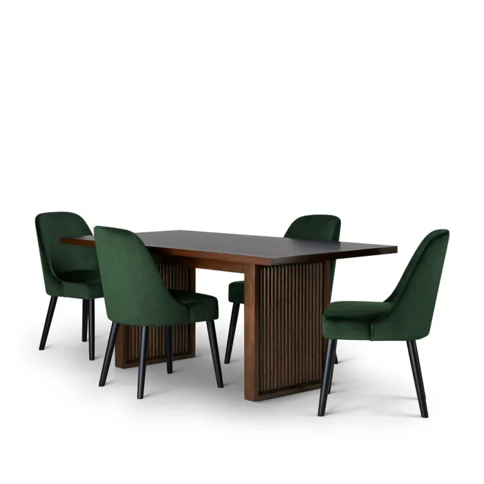 Be the first to review “Modern Wooden Dining Table with Ribbed Base and Green Velvet Chairs (Set of 4)” Cancel reply